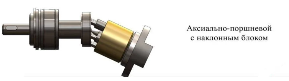 Перекачивание жидкости в таких насосах с наклонным блоком осуществляется через отверстия в стационарном распределительном устройстве. Благодаря своей особой конструкции рабочий объем камеры можно изменять, что достигается путем регулировки угла наклона блока относительно оси приводного вала.